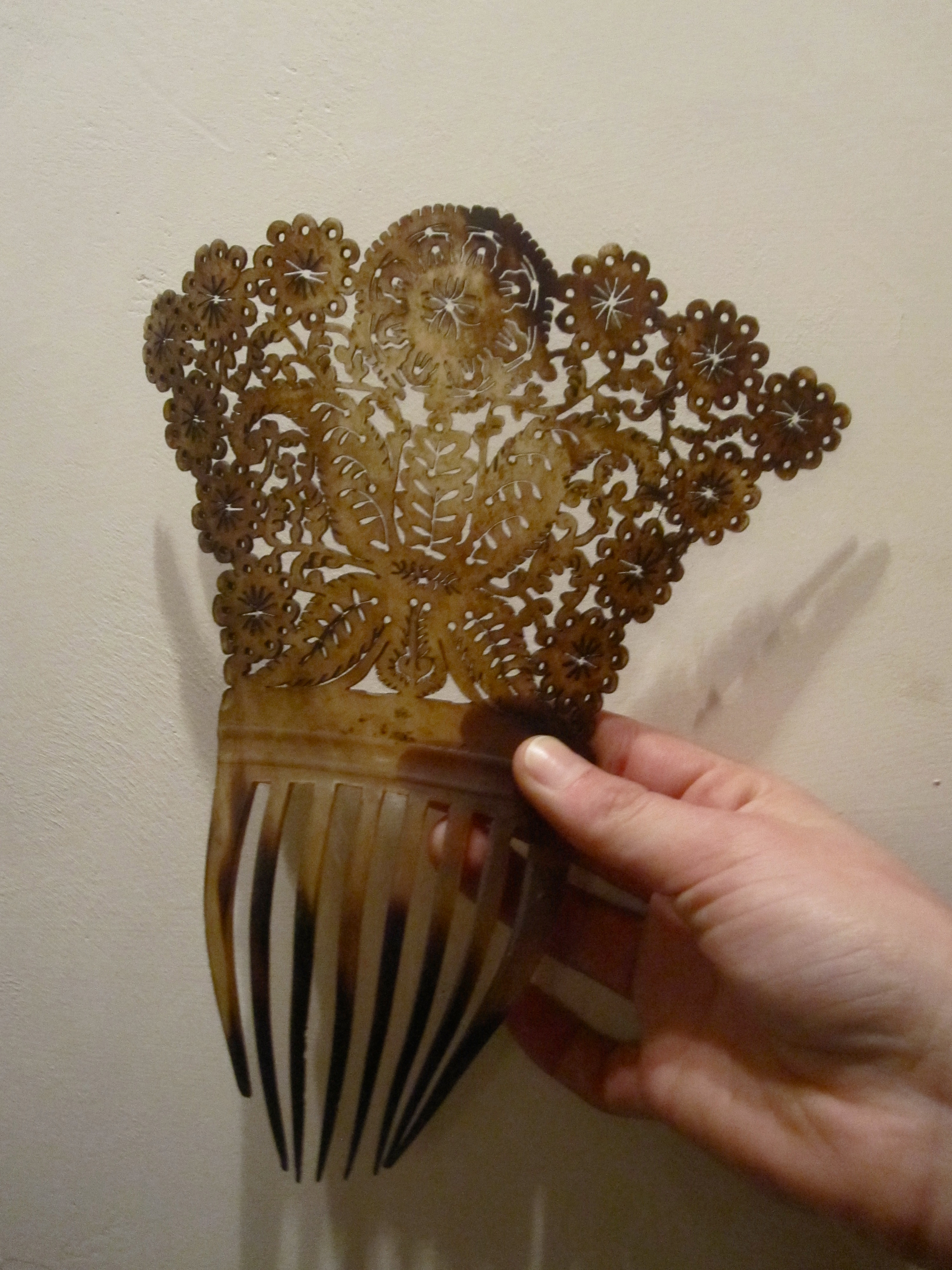 This set, with its own custom box, is probably real coral. Below is a hair comb, made of turtle shell. These two pieces are the only real “precious” pieces in the case. In love.