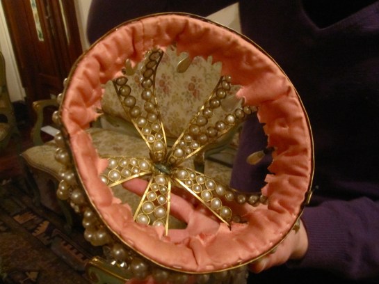 The plastic pearls are sewn into place, and here we also can see some sneaking oxidation from the metal under the gold plating.
