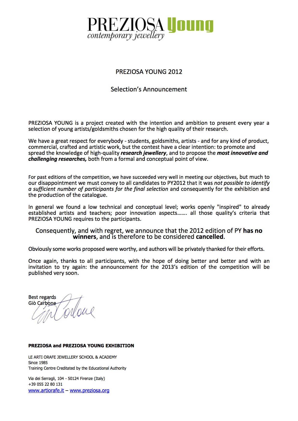 The last appointment will be a presentation/exhibition of Preziosa 2013 which includes Karin Seufert, Philip Sajet, Suska Mackert, David Bielander, Sophie Hanagarth, and Sigurt Bronger, and Preziosa Young with winners, Panjapol Kulpapangkorn, Rob Elford, Benedikt Fischer, Karin Roy Andersson, Wan Hee Cho, Chiara Scarpitti, Antje Stolz, and Lauren Vanessa Tickle.