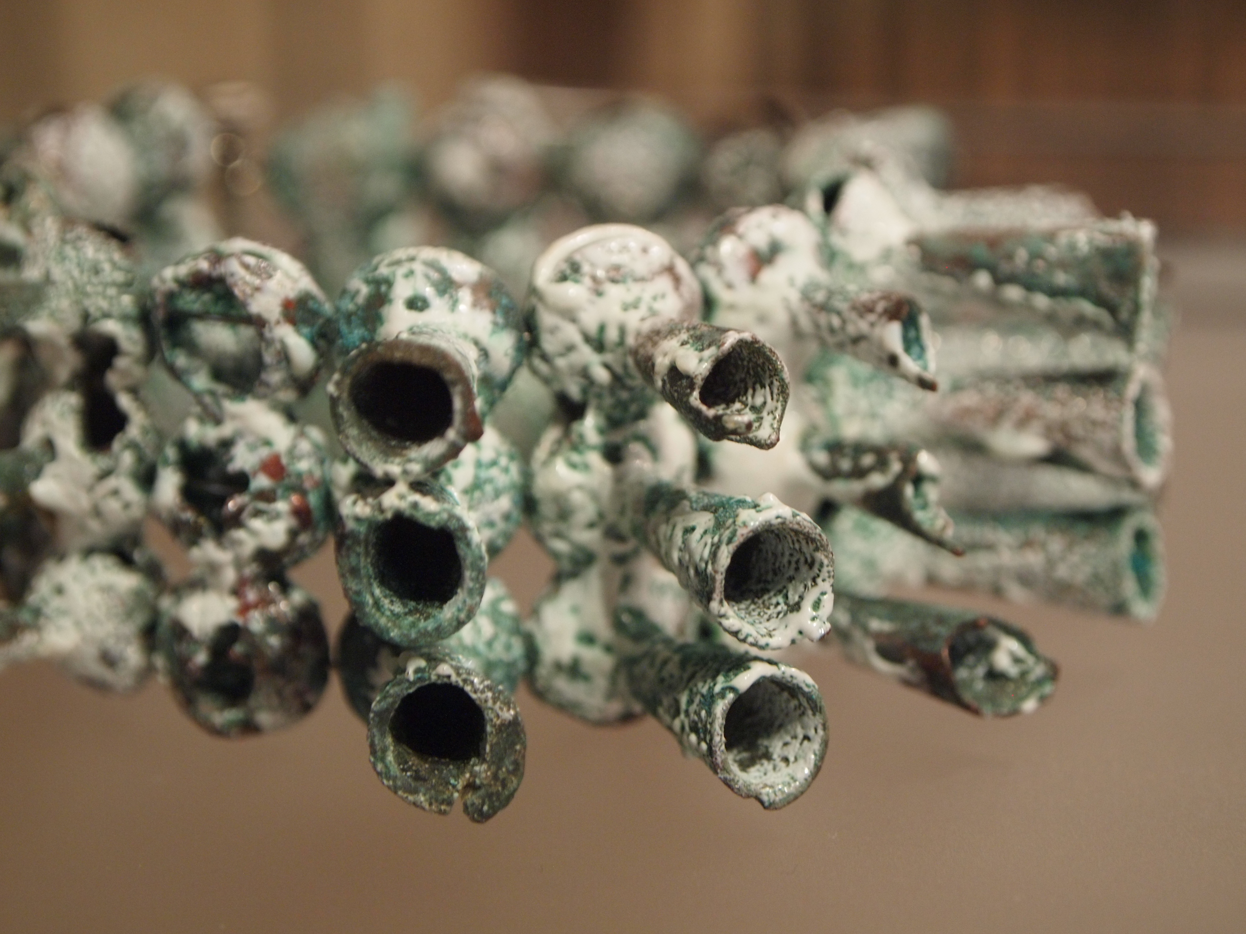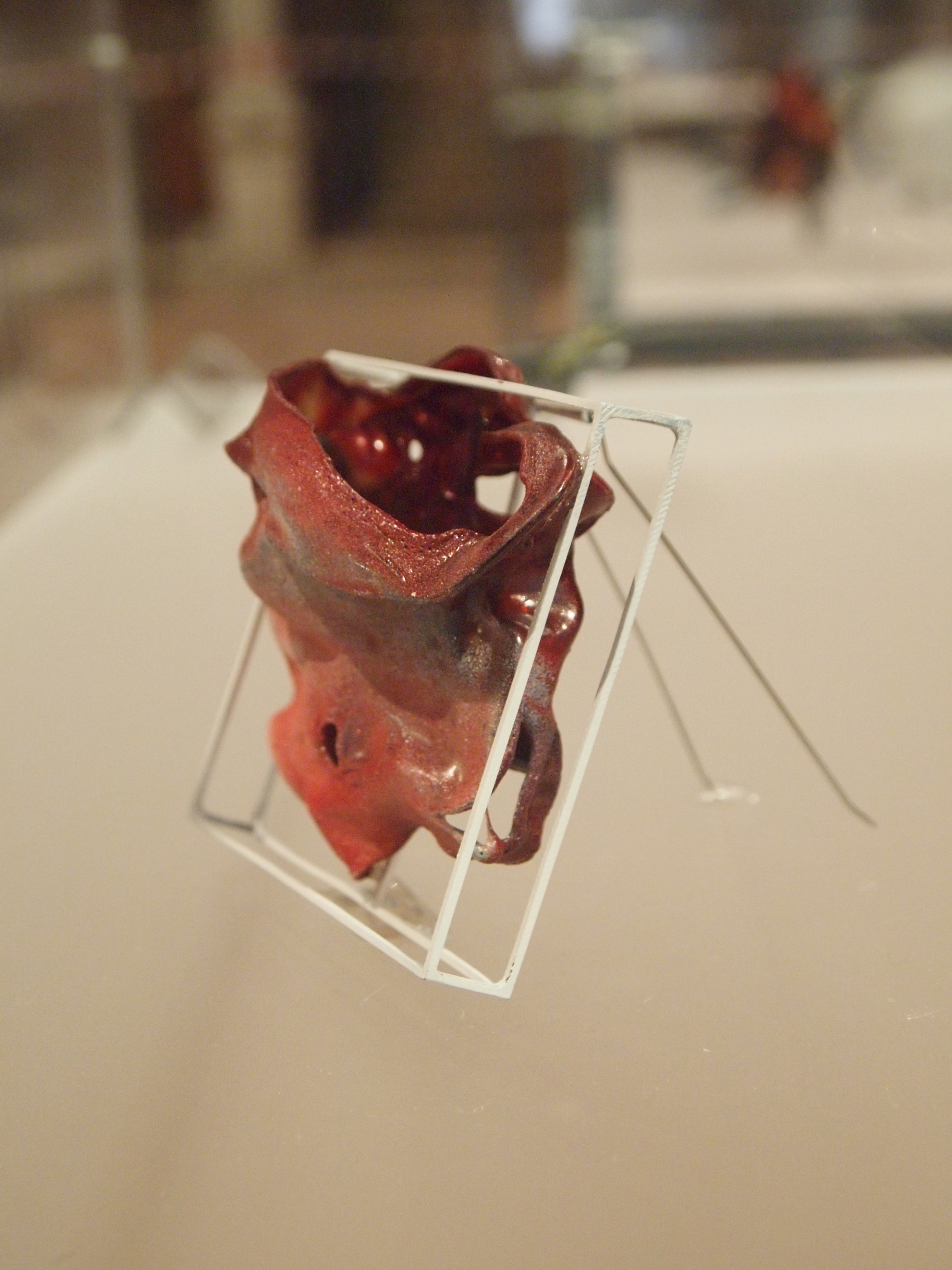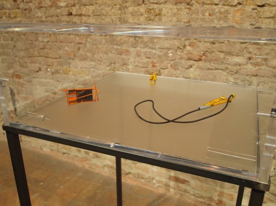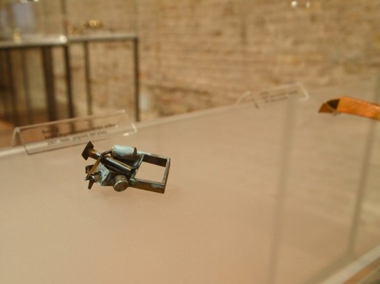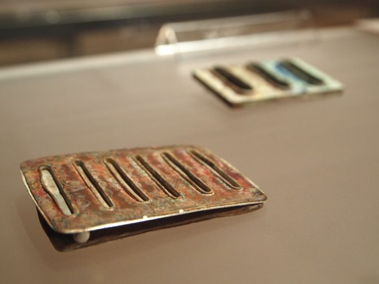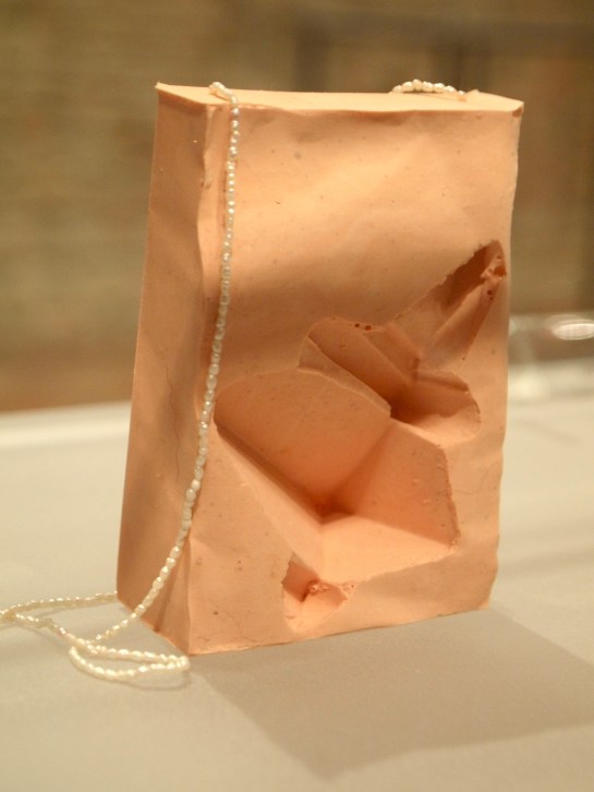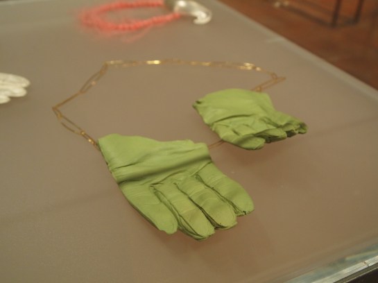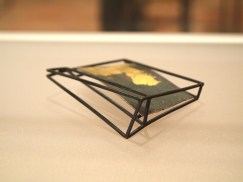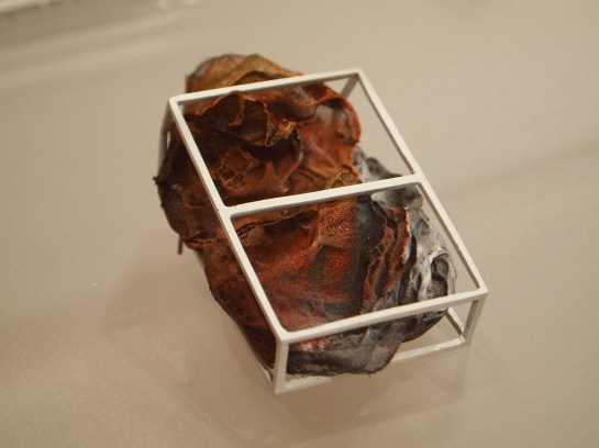 At first glance, Galindo’s work provides a sense of conventional familiarity- two ordinary black pedestals with vitrines stand side by side. I can’t recall any other artworks in the entirety of the Biennale that utilize such presentational standards. The cases are reminiscent of typical display conventions seen in museums and in my opinion, passé contemporary jewelry shows that close off the work to those who wish to understand it, while also giving it a sense of preciousness and distance. It may seem that I am speaking negatively, but here we find qualities beyond that of unoriginal jewelry displays that commonly use the same devices. The blurb next to one of the works entitled, Looting (2010), affirms my suspicions that the pedestal is not just a means of display, but also is part of the work itself (this is indicated by the size description, 136x38x38 cm), a step up from the detrimental qualities this same convention afflicts on objects made within the realm of jewelry.