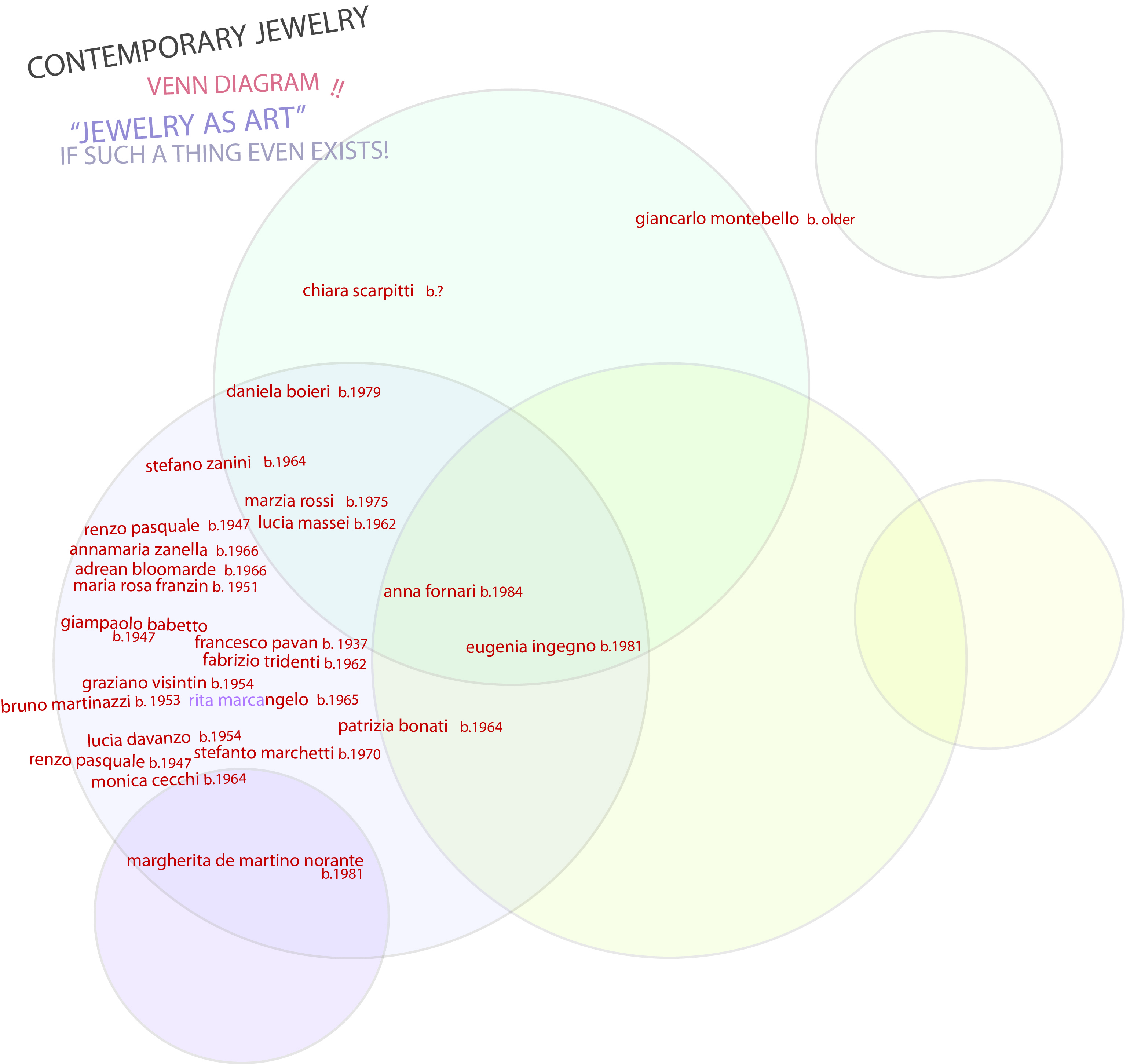 To better illustrate what I mean, here is a version of the Jewelry as Art Venn Diagram posted under the COSMOLOGY section at the very top of the page where I have isolated the Italian artists in order to see how they approach their work. Almost all of the artists are categorized in the Jewelry as Sculptural Object sphere (click on cosmology to see the full context).