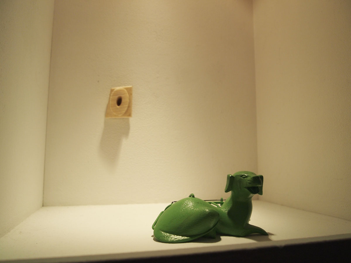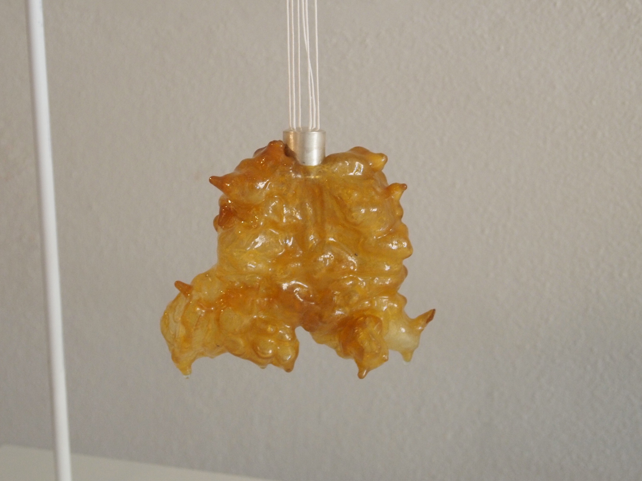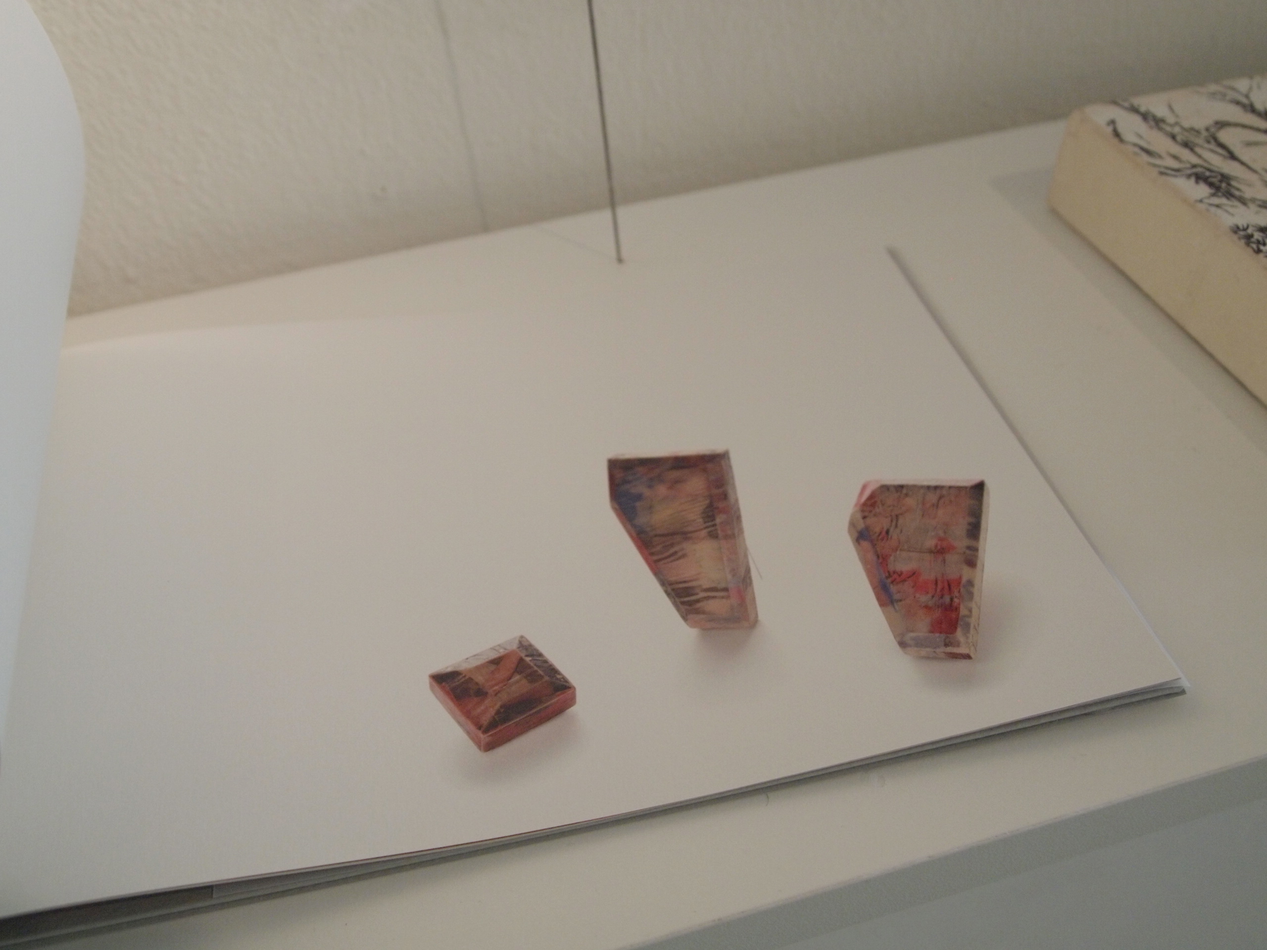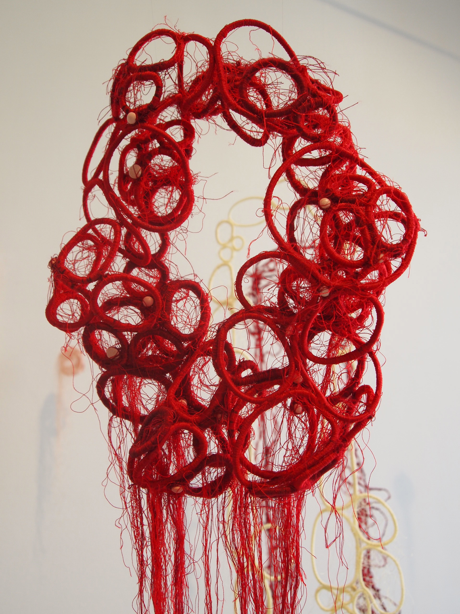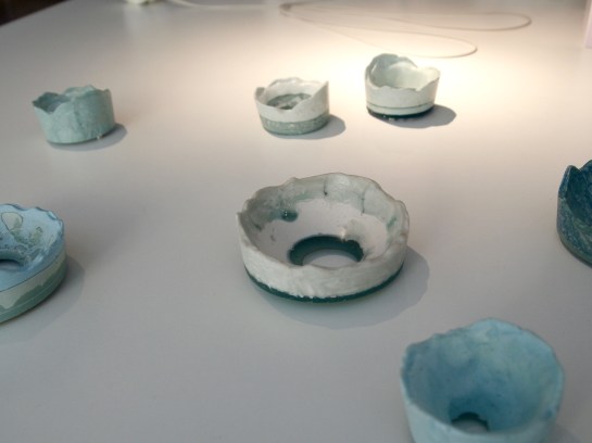 With regard to exhibition install overall, the show starts on a short-lived high note as few other artists were allotted such a generous space for contextual display. Spatial constraints of the room could be partially to blame, certainly. But could it also be due to a lack of consideration and/or demand for an apt theoretical framework to the work? For some artists, perhaps yes. For Patrick Davison (Great Britain) however, his series Talking, isn’t in need of such support. Davison’s pieces stand autonomously on the first of the white tables, paired appropriately with Guilia Savino (Italy) and Weronika Marek (Poland). The series title is a delicate boost to their aesthetic independence –a product of a transcendence of materials (plaster or latex with silver and string) and a continuity of idea that elicits a strong lasting impression. Hot and delicate breath carried through a succession of string lifelines is evidence of a symbiotic relationship where talking is in fact making for Davison.