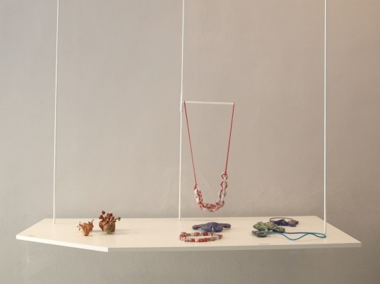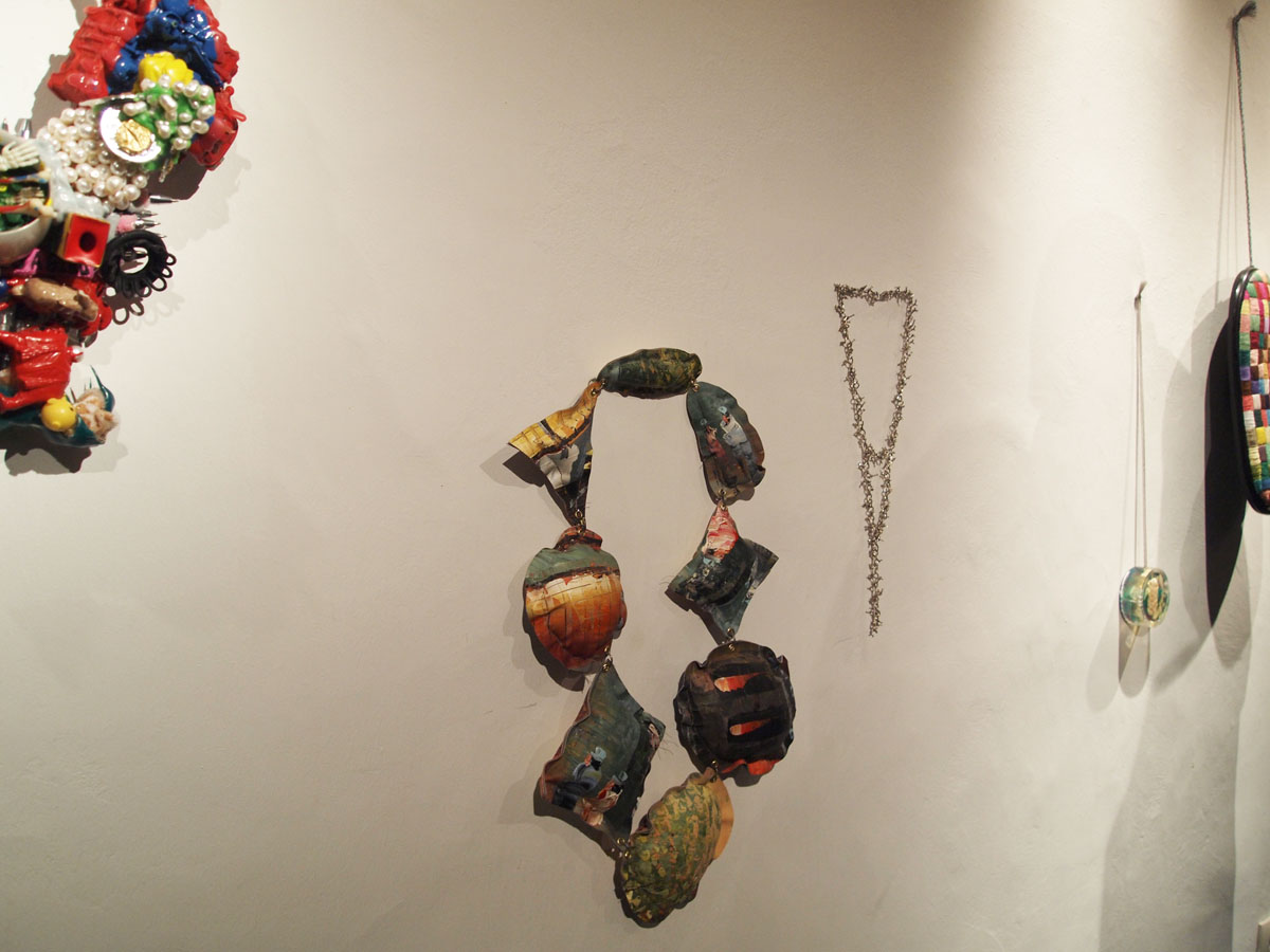So then what does it really mean to put on an artwork, to adorn oneself with a summary of feelings, past events, ideas? Where can a personal connection be found, between maker and object, or object and future wearer? Some Alchimia graduates were capable of asking and simultaneously answering questions like these; Hamilton’s Praise serves as a humble example. Valentina Caprini (Italy) pushes it further by presenting a fresh take on the fundamental roles of jewelry vs. a devotion to them, successfully achieving equilibrium in her series, Therapy. The distinctive collection, displayed suspended from the ceiling (one of two collections first mentioned seen through the window), is so aptly titled that one can walk away with the word slipping off their tongue without having known it prior. Caprini’s work speaks on multiple levels including reinvention of tradition, making/wearing as healing, self-growth and remembrance, and femininity. The four woven necklaces into which pills have been sewn (and the trio of fleshy brooches) independently possess a strong emotive presence owed to the delicate and deliberate touch of the artist. In addition to a unique tactile quality, Caprini has involved an accessible depth to her work worthy of further contemplation.