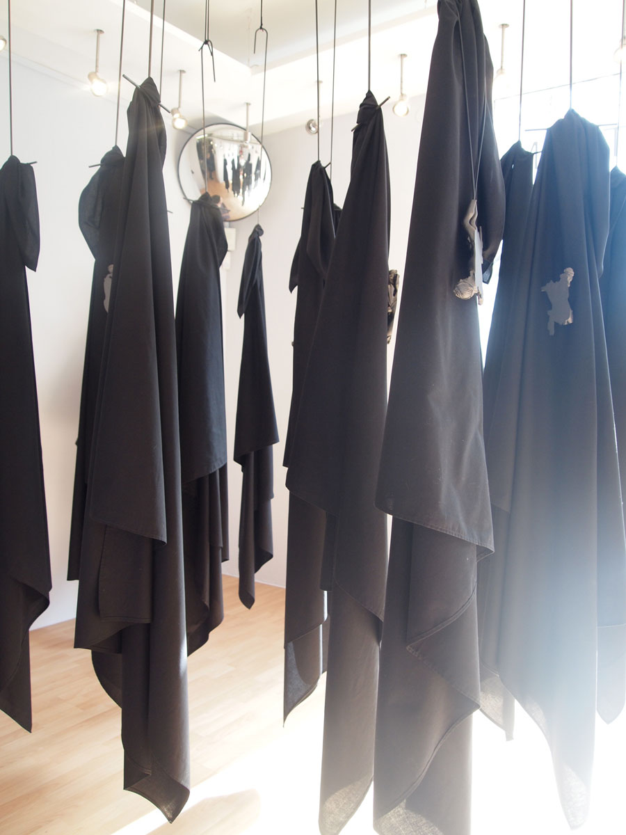 Ruudt Peters’ exhibition Corpus showcased a ring of black cloaks hanging from the ceiling, an installation seen before at Galerie Rob Koudijs last September. Peters is known for taking advantage of space to communicate the fundaments of his works, which this specific installation certainly does. Historically speaking, Peters was one of the first to be recognized for new and innovative display conventions (in 1992 his Passio series, for example, included an exhibition where he also enclosed hanging fabric from the ceiling to the floor around the floating pieces so that one would have to gently find their way in to view the work).