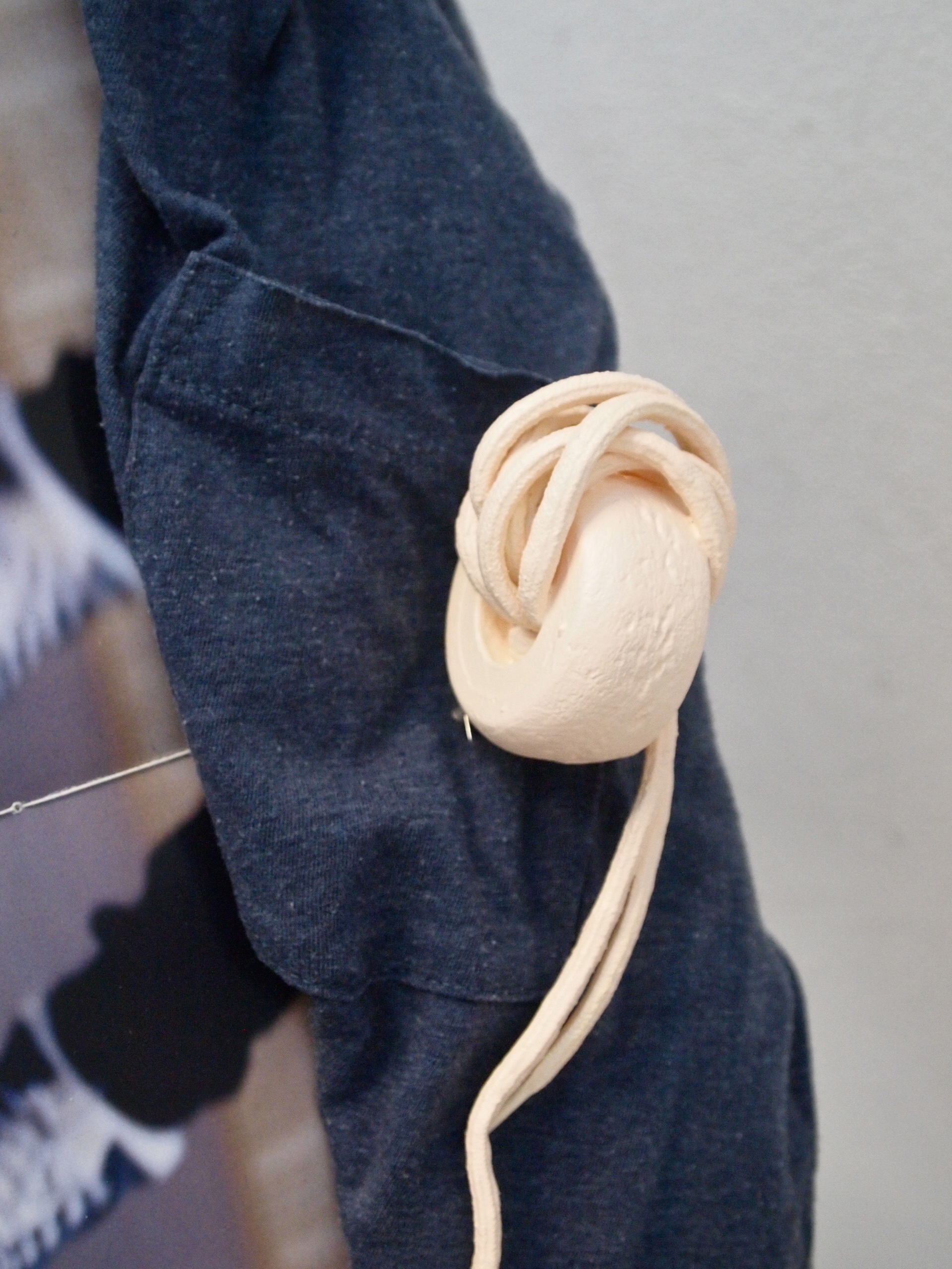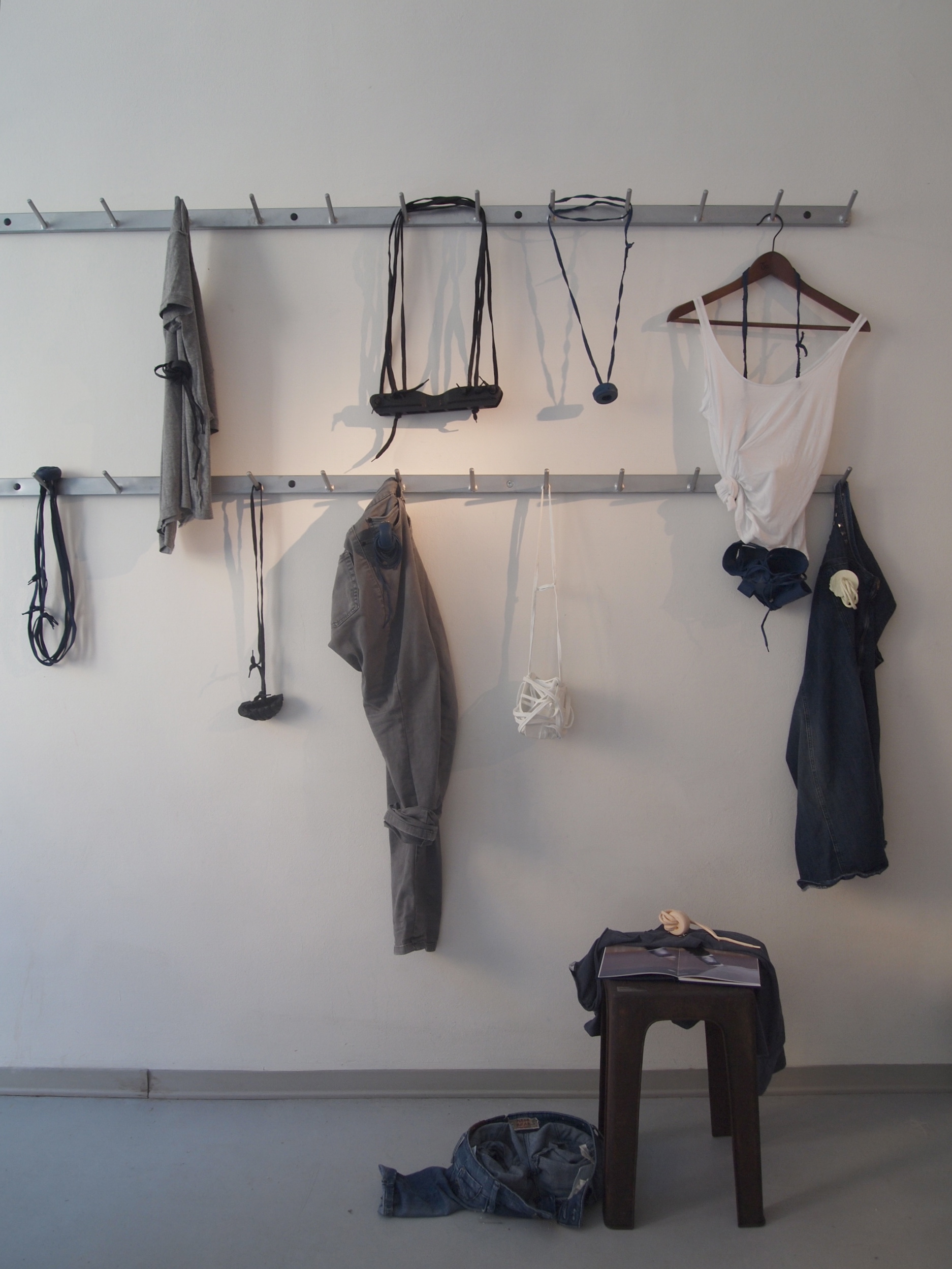 The series of Izabella Petrut (Romania) is a self-proclaimed love story retold by dismembered roller blades and skating paraphernalia–turned jewelry objects. Pinned to and draped over similar colored clothing and casually thrown about denim, the work in hues of slate, cold blues and off-whites is tangled in disguise, as Petrut’s series seems at first to be hardly sentimental. Choosing titles for her shoe lace-wrapped wheel brooches like “sunrise on the beach…” and “the first morning…” the question that remains is whether the work really does retell the love story that the pieces represent, or if we can accept and maybe even enjoy the visual disconnect between object and intention.  The especially flesh-toned wheel brooch (installed pinned to a shirt draped over a stool) starts to bridge this gap by insinuating a bodily connection. Ultimately, the relative ambition of the installation can be appreciated in comparison to other setups. Petrut’s ability to mirror the subtle yet familiar essence of the physical objects can be thanked for its success. More importantly, Petrut’s series, A Love Story, stays true to the jewelry’s position as the emotional and the everyday, while effectively avoiding aesthetic (but perhaps not verbal) redundancy and trite clichés.