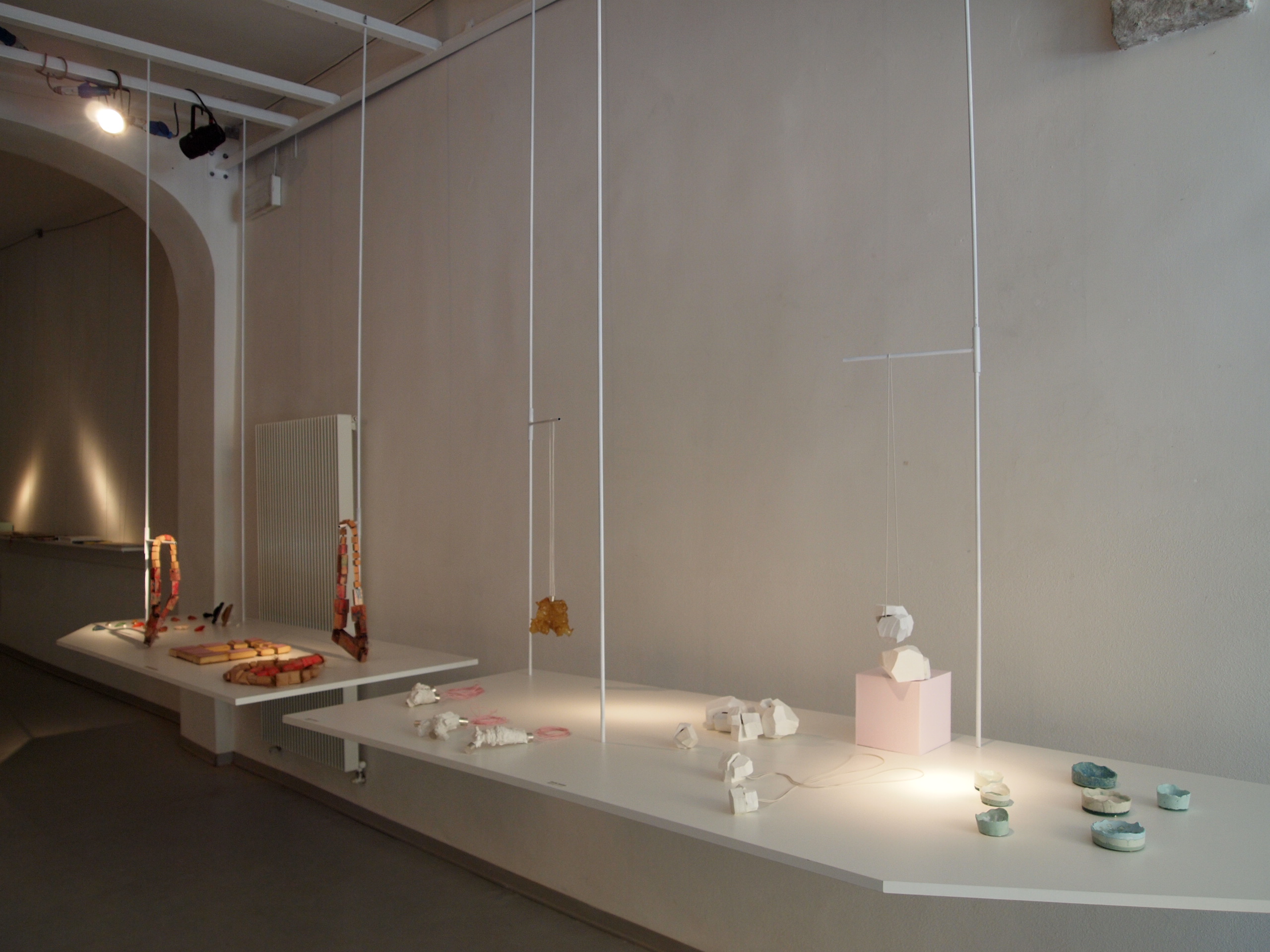 A division does endure between these three artists despite the close quarters, characterized by diverse explorations with material. This can be said for most of the Alchimia graduates, yet certain artists more soundly developed profound bodies of work that surpass a reliance on material as concept. How does materiality relate to the overall strength of a piece? Marek’s series, Into Emptiness, is worth mentioning here. The name, the objects—brooches comprised of cold cylinders in softly melting shades of icy blues and whites—and the sentiment all add up; knowing what they are made of is more of an added curiosity than it is crucial.