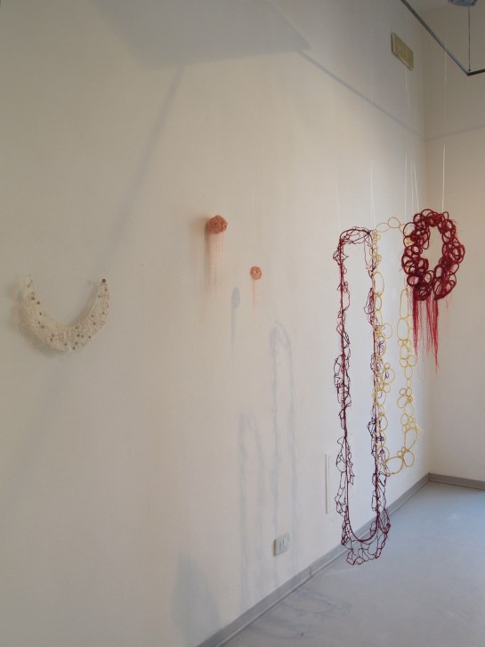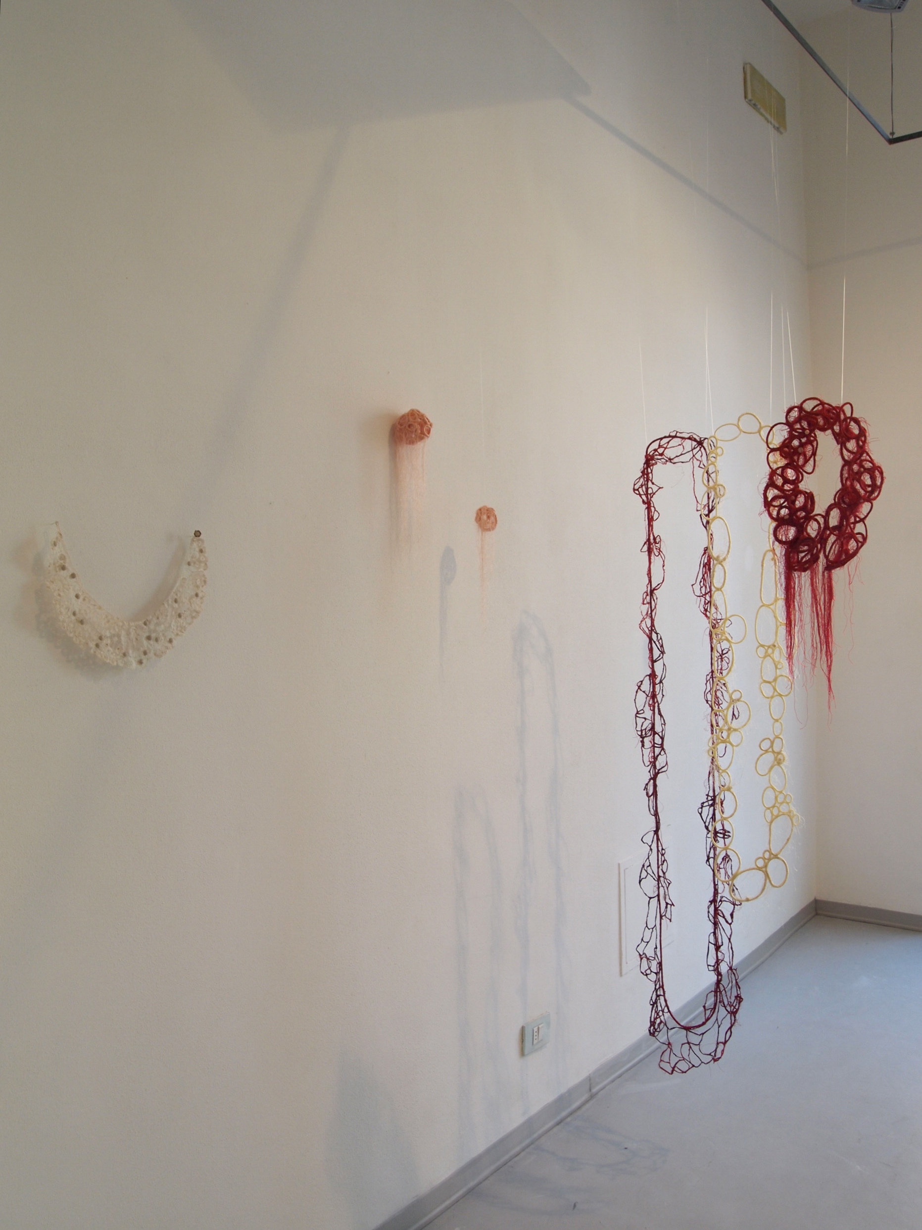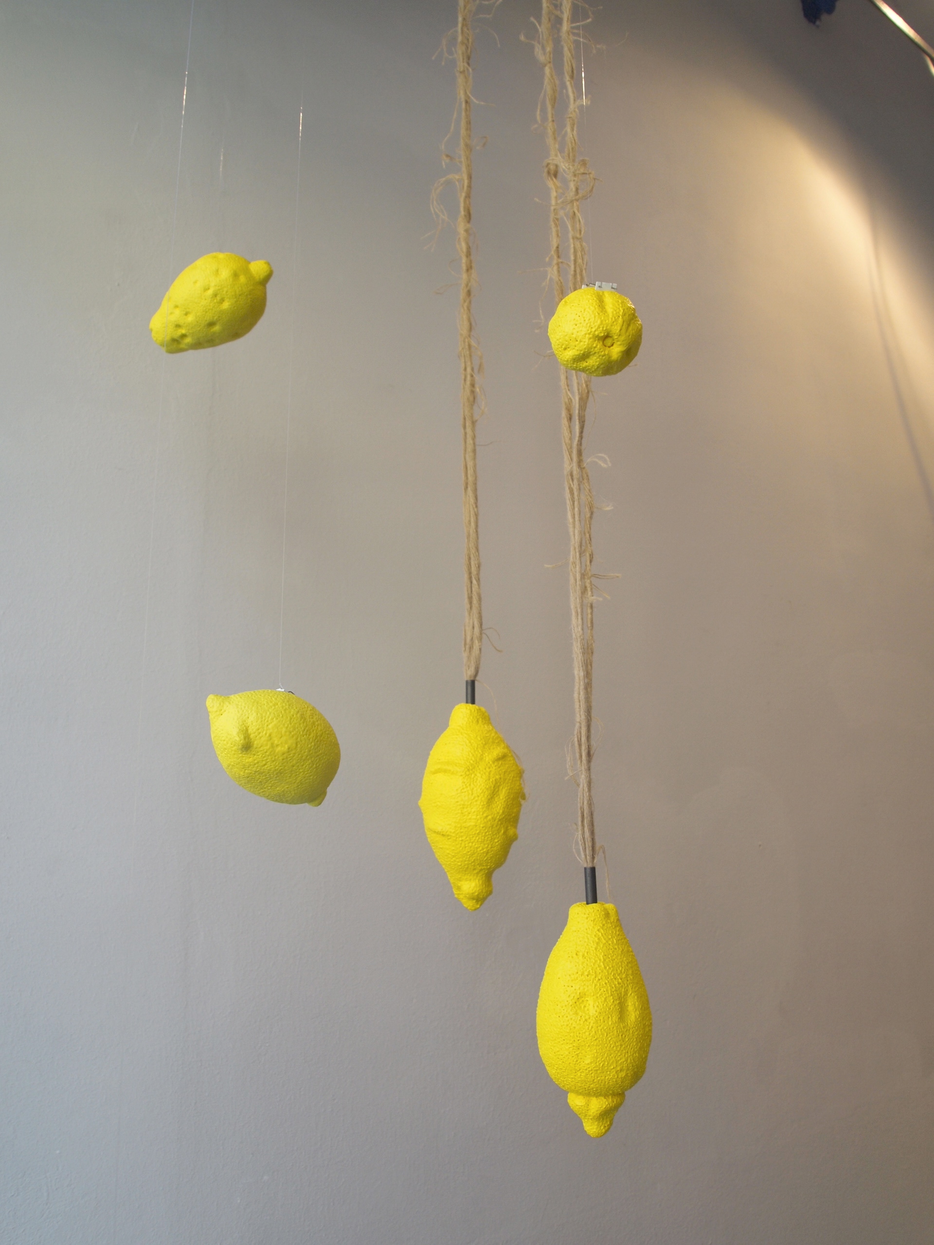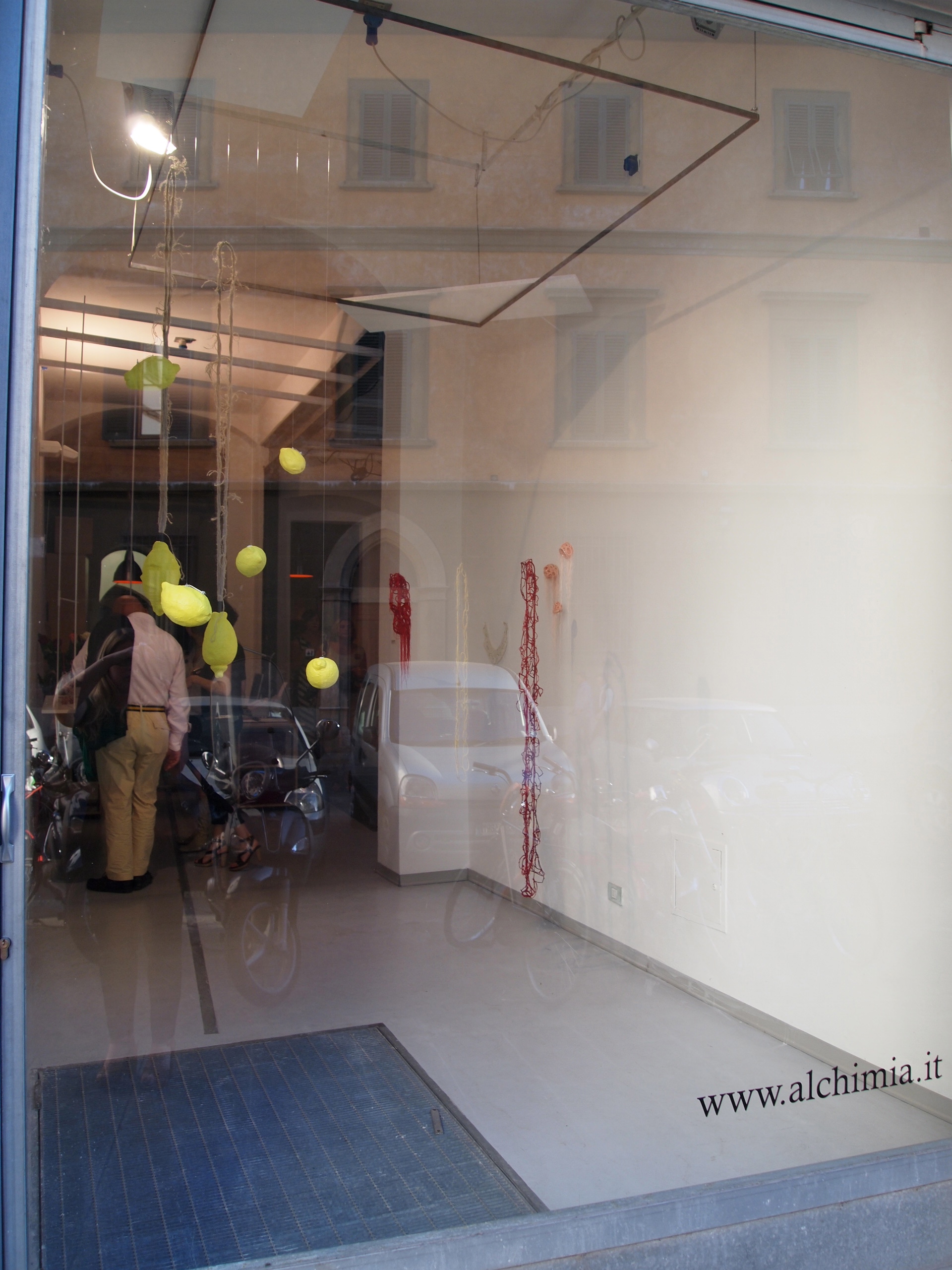 Multiple yellow citruses suspended in the foreground of woolly red and fleshy pink masses only scarcely hint to the world in which these puzzling objects belong. The hanging work seen through the large window of Alchimia acts as a mysterious aperitivo to the average passerby surely stumped by the question “what is this I’m looking at?”