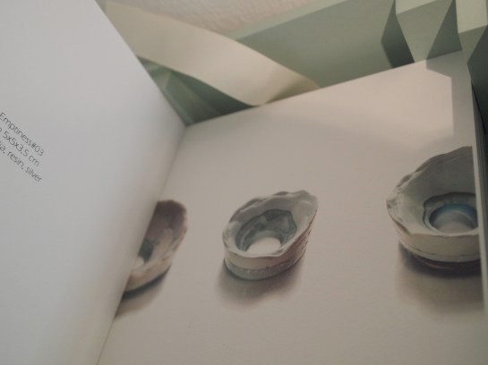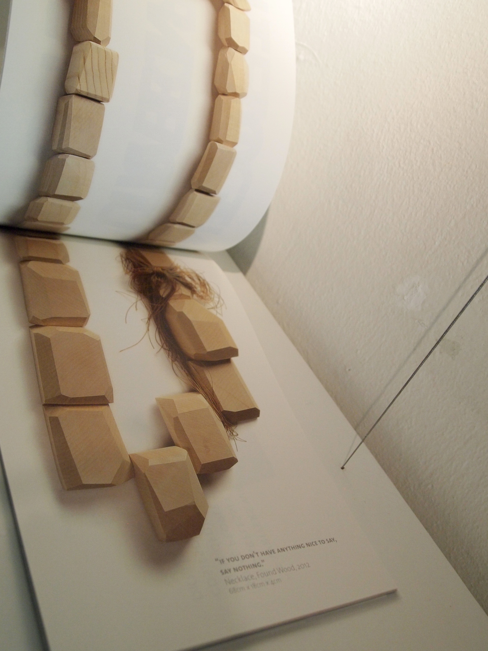 Other books begin to call into question the selection decisions of curator, Christoph Zellweger, by exposing what he decided to include in the show and what he has decided to leave out. For example, some of Davison’s stronger and more varied pieces are excluded, similar to Lee, and the same goes for Anna Helena Van de Pohl de Deus (USA), Lee’s display tablemate. Helena’s exhibited work becomes more so affected after looking through her book. Not only does the book show more interesting works, but it also reveals a disconnect between concept and final product. By including a lot of quotes about talking, silence and language, Helena’s book proposes that the objects for her series, com∙mu∙ni∙ca∙tion, are supposed to stand in for her own communicative inabilities. If they’re meant to speak for her, what do they actually say? Her painterly neckpieces of pinks and natural wood are compositionally pleasing and probably fun to wear. Are these merely visual qualities lessened by the mismatch of object to verbal framework, thus failing to really say anything at all?
