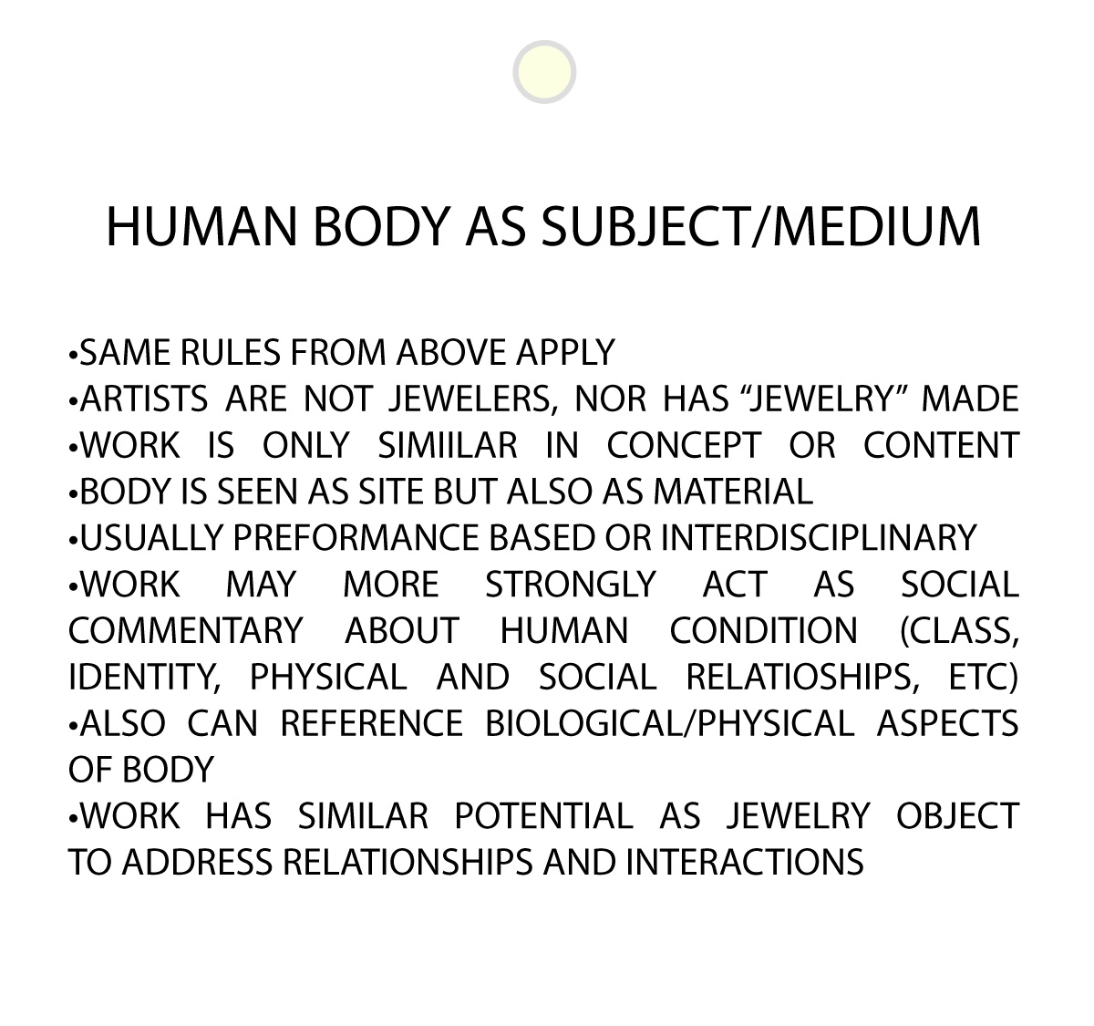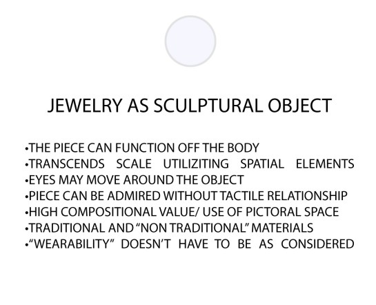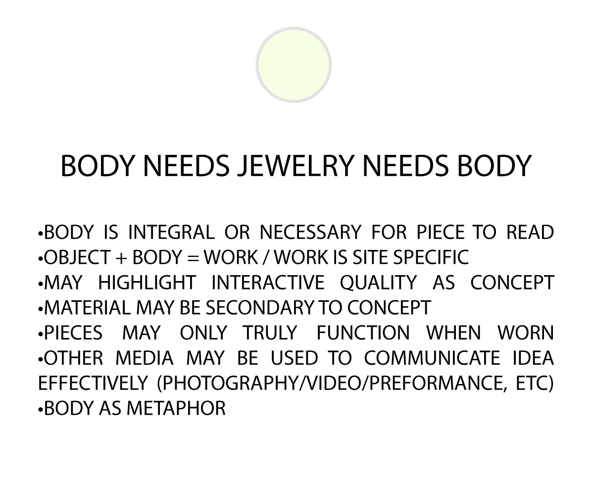 •PROCESS AND MATERIAL ARE INHERENT FUNDAMENTS, NOT WHOLE CONCEPTS. THESE DECISIONS ARE A REFLECTION OF THE IDENTITY OF THE ARTIST AND MAY OR MAY NOT ENHANCE THE IDEA BEHIND THE PIECE. FOR EXAMPLE, SOME MAY SAY METAL IS A MEDIUM, BUT ONE CAN ARGUE THAT JEWELRY IS THE MEDIUM.