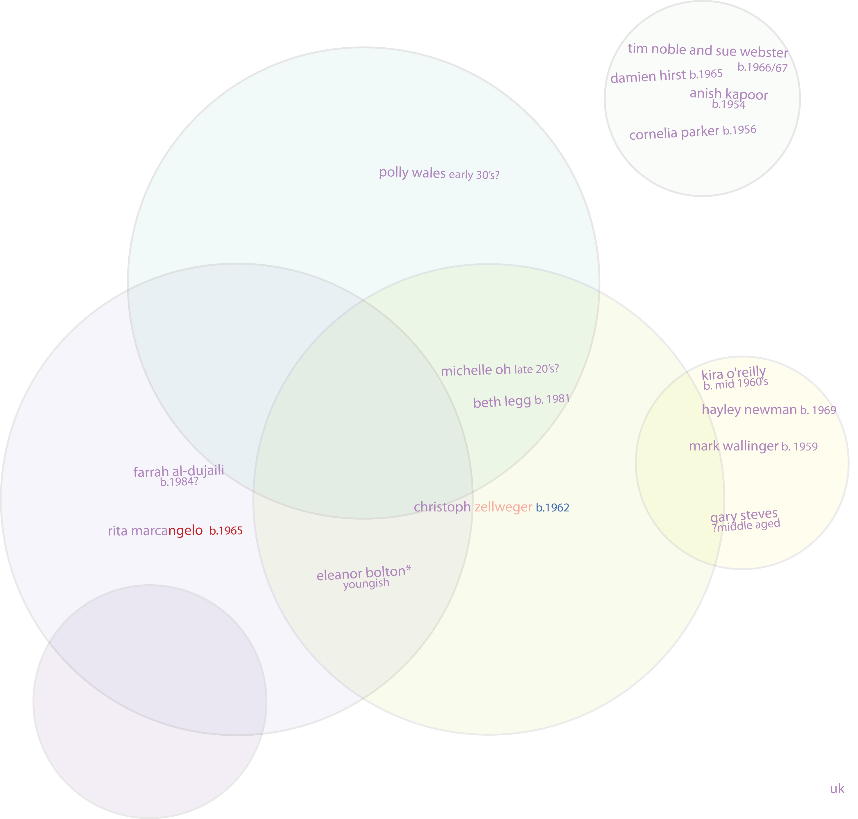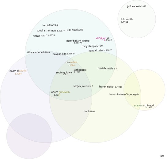 THE ARTISTS INCLUDED IN THIS DIAGRAM WERE CRITICALLY CHOSEN BASED ON THE QUALITY OF THEIR WORK. THEY ARE COLOR CODED BY COUNTRY IN WHICH THEY WERE PRIMARILY TRAINED. BIRTH YEARS ARE ALSO INDICATED WHEN AVAILABLE. (CLICK TO MAKE LARGER)