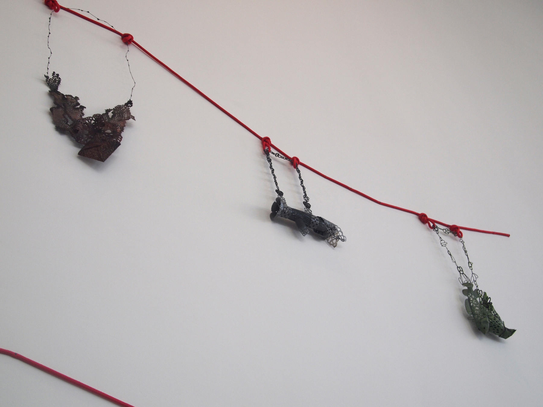 If one was to compare the display conventions of the Pinakothek’s contemporary jewelry collection to that of other international art museums, there is an obvious standard. Although the Pinakothek’s devoted environment is extremely spacious and impressive, the shared standard is still a banality that unfortunately extends its reach all too often. Whether elevated off the ground on pedestals or vertically assembled against a wall, seeing works in jewelry behind glass is almost always the norm (the MFA Boston, MAD NYC, the V&A in London, click —> here for a nice video about the Pinakothek’s collection…). It can be said that the usually plentiful pieces that make up a series for exhibition have to be installed; the space is curated in a straightforward manner that normally remains indifferent to the work and its ideas as dictated by the limitations of the cases. It’s a unique problem, summarized well by Liesbeth den Besten in her book, On Jewellery, A compendium of international contemporary art jewellery.